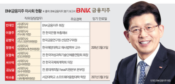 이사 임기 만료가 임박했다는 점도 제도 도입 검토 배경으로 꼽힌다. BNK금융 분기보고서에 따르면 오는 3월 빈 회장을 포함해 사내이사 1명, 사외이사 6명 등 총 8명 가운데 7명의 임기가 만료된다. 이사회가 대폭 교체되는 시점에 주주와 당국의 요구를 수용함으로써, 연임 과정에 제기된 논란을 불식시키고 시장 신뢰를 회복하겠다는 계산이다.