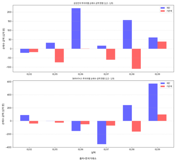 13일 한국거래소에 따르면 이달 초(1월 2일~9일) 기관투자자가 코스피 시장에서 가장 많이 판 종목 1위는 삼성전자로 나타났다. 기관은 이 기간 삼성전자 주식을 약 1조5978억 원어치 순매도했다. AI 메모리 주도권을 쥔 SK하이닉스 역시 3373억 원의 매도 우위를 기록하며 기관의 차익 실현 리스트 상단에 이름을 올렸다.