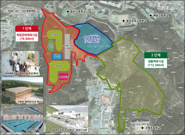 개발은 자연환경 보전과 경관 훼손 최소화를 원칙으로 단계적으로 추진된다. 1단계 사업은 기존 군 시설이 밀집한 약 7만8900㎡ 부지에 다목적체육관과 야외체육시설, 주차장 등을 갖춘 복합문화체육시설을 조성하는 내용으로, 사업비는 약 280억원이 투입된다. 부산시는 올해 도시계획시설 결정과 기본계획 수립을 마친 뒤, 내년 실시설계와 토지 매입을 거쳐 공사에 착수해 2029년 준공을 목표로 하고 있다.