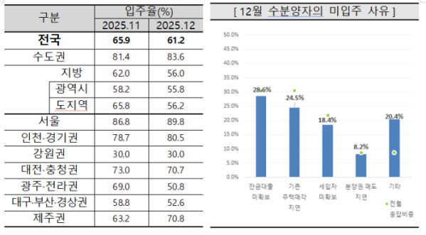미입주 사유로는 잔금 대출 미확보가 28.6%로 가장 많았고 기존 주택 매각 지연과 세입자 미확보가 뒤를 이었다. 연구원은 연말 시중은행의 신규 주택담보대출 접수 중단이 입주율 하락의 주요 원인이라고 설명했다.