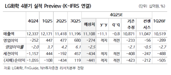 최영광 NH투자증권 연구원은 "LG화학은 LG에너지솔루션의 미국 공장 가동률 저하, 라인 전환 비용 발생 등을 반영해 2026년 영업이익 전망치를 하향했다"며 "LG화학 기업가치 산정 시 반영하는 LG에너지솔루션의 영업가치를 기존 54조 원에서 43조 원으로 하향했다"고 말했다.