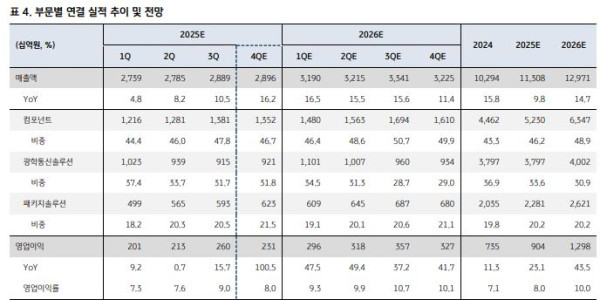 삼성전기의 지난해 4분기 실적은 매출액 2조9000억 원, 영업이익 2306억 원으로 추정했다. 이 연구원은 “비수기에도 성수기급 실적을 기록할 전망”이라며 “원·달러 환율이 우호적인 흐름을 보인 가운데 IT용 부품 대신 AI 서버와 전장용 등 고부가 부품의 비중이 증가함에 따라 고질적인 계절성이 희석된 것으로 추정된다”고 분석했다.