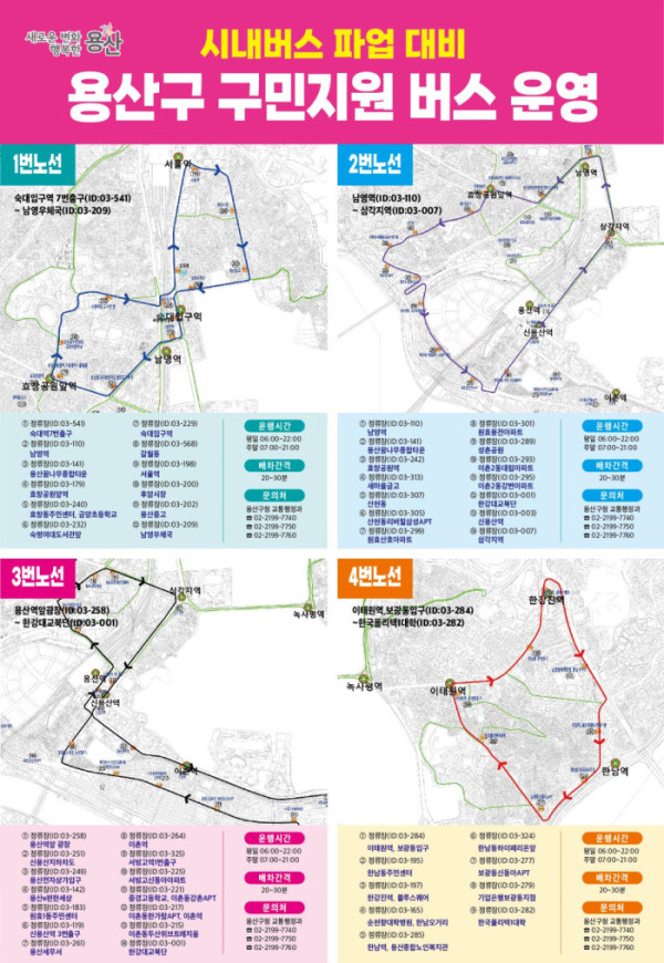 박희영 용산구청장은 “시내버스 파업이라는 돌발 상황 속에서도 구민들의 출·퇴근과 일상 이동에 차질이 발생하지 않도록 비상수송체계를 신속히 가동했다”라며, “현장 상황을 면밀히 점검하며 구민 여러분께서 안심하고 이동하실 수 있도록 끝까지 최선을 다하겠다”라고 밝혔다.