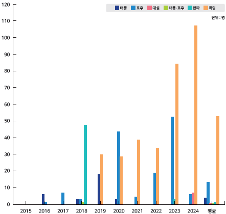 자연재난 중 인명·재산 피해가 발생한 재난은 총 35건으로, 최근 10년 평균(29건) 대비 6건 증가했다. 유형별로 호우(13건), 대설(10건), 폭염(4건) 순이다. 자연재난으로 인한 사망·실종자는 총 121명으로, 최근 10년 평균(56명) 대비 65명 증가했다. 원인별로 폭염으로 인한 사망(108명)이 가장 많았고, 이어 대설(7명), 호우(6명) 순이었다. 폭염에 의한 사망·실종자 수는 2019년 이후 추세적으로 증가하고 있다. 한파 사망·실종자는 2018년 일시적으로 늘었었다.