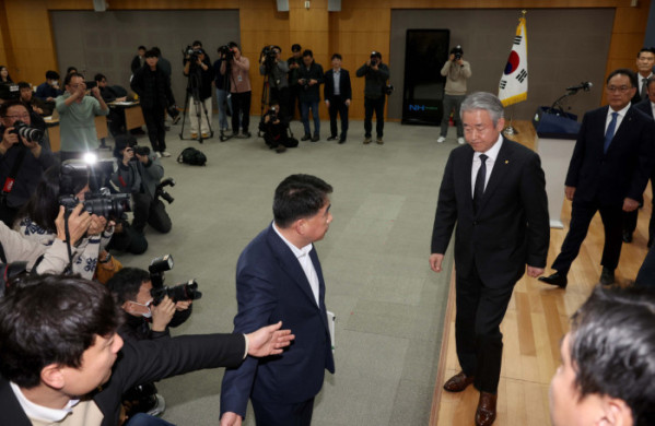 ▲강호동 농협중앙회 회장이 13일 서울 중구 농협중앙회에서 농식품부 특별감사 중간 결과 발표와 관련해 대국민사과를 한뒤 나서고 있다. 강 회장은 사과문에서 "국민과 농업인 여러분의 기대에 부응하지 못하고 심려를 끼쳐드린 점에 대해 책임을 통감하며 진심으로 사과드린다"며 "이번 사안을 단순한 위기 수습이 아닌 농협의 존재 이유와 역할을 바로 세우는 출발점으로 삼겠다"고 밝힌뒤 겸직하던 농민신문사 회장직과 농협재단 이사장직에서 물러날 뜻을 전했다. 신태현 기자 holjjak@