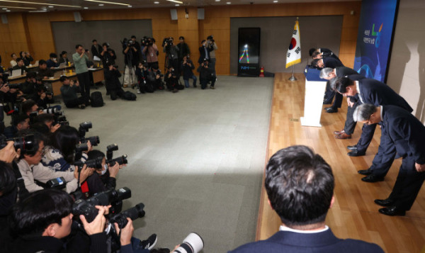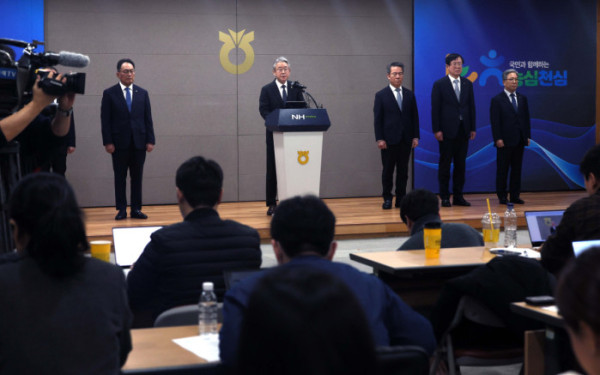 ▲강호동 농협중앙회 회장과 임원들이 13일 서울 중구 농협중앙회에서 농식품부 특별감사 중간 결과 발표와 관련해 대국민사과를 하고 있다. 강 회장은 사과문에서 "국민과 농업인 여러분의 기대에 부응하지 못하고 심려를 끼쳐드린 점에 대해 책임을 통감하며 진심으로 사과드린다"며 "이번 사안을 단순한 위기 수습이 아닌 농협의 존재 이유와 역할을 바로 세우는 출발점으로 삼겠다"고 밝힌뒤 겸직하던 농민신문사 회장직과 농협재단 이사장직에서 물러날 뜻을 전했다. 신태현 기자 holjjak@