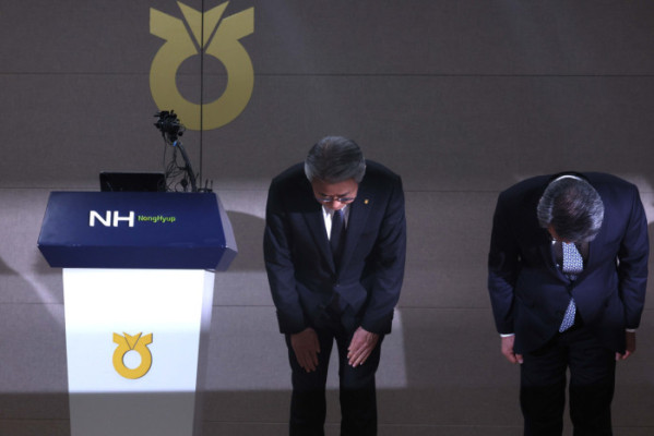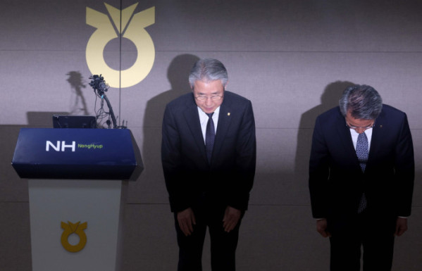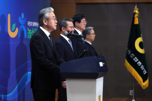 강호동 농협중앙회 회장과 임원들이 13일 서울 중구 농협중앙회에서 농식품부 특별감사 중간 결과 발표와 관련해 대국민사과를 하고 있다. 강 회장은 사과문에서 "국민과 농업인 여러분의 기대에 부응하지 못하고 심려를 끼쳐드린 점에 대해 책임을 통감하며 진심으로 사과드린다"며 "이번 사안을 단순한 위기 수습이 아닌 농협의 존재 이유와 역할을 바로 세우는 출발점으로 삼겠다"고 밝힌뒤 겸직하던 농민신문사 회장직과 농협재단 이사장직에서 물러날 뜻을 전했다.