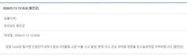 13일 오후 2시 24분께 함안군 칠서면 산업단지에서 암모니아 물질이 소량 누출되는 사고가 발생했다.