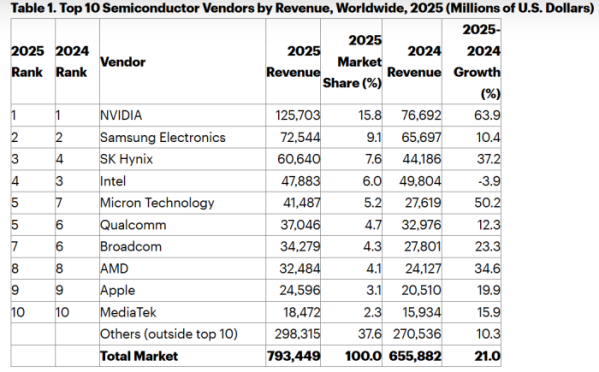 한편, 가트너의 순위는 반도체를 직접 설계해 자체 브랜드로 판매하는 업체를 기준으로 집계돼 순수 파운드리(반도체 위탁생산) 기업인 대만 TSMC는 이번 조사 대상에서 제외됐다. TSMC가 최근 발표한 실적에 따르면 2025년 매출은 약 1170억 달러로, 엔비디아에 이은 전 세계 2위 규모다.