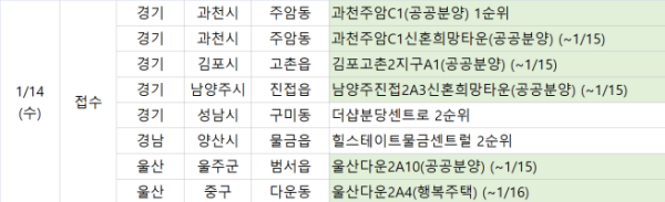 부동산 정보업체 부동산R114에 따르면 14일 오늘은 경기 과천시 ‘과천주암C1’ 공공분양 단지에서 1순위 청약 접수가 진행된다. 또 경기 성남시 ‘더샵분당센트로’, 경남 양산시 ‘힐스테이트물금센트럴’은 2순위 청약 접수를 받는다.