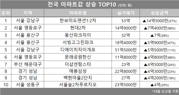 ▲13일 신고일 기준, 전국 아파트값 상승 TOP10을 정리한 표가 실거래가와 상승 금액·비율 등 주요 지표와 함께 제공되고 있다. (자료제공=호갱노노)