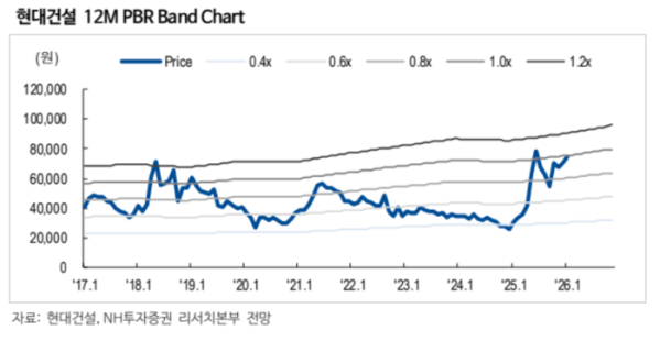 이 연구원은 “현대건설 주가가 2025년 하반기 이후 두산에너빌리티와 높은 동조성을 보이며 원전주로서 리레이팅 국면에 진입했다”고 평가했다. 특히 2026년 수주가 기대되는 팰리세이즈 소형모듈원자로(SMR)와 불가리아 대형 원전 프로젝트의 매출 기여가 2027년부터 본격화될 것으로 전망되면서 원전 사업의 실질적 가치가 실적에 반영되는 시점이 명확해졌다는 분석이다. 이에 따라 NH투자증권은 건설 부문의 가치 산정 기준 시점을 원전 매출이 실제로 발생하는 2027년으로 조정했다.