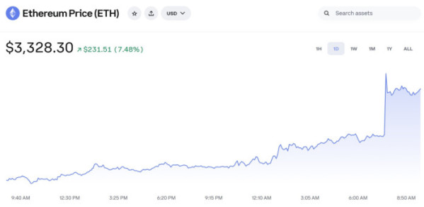 이더리움이 하루 새 7% 넘게 급등하며 가상자산 시장 전반의 상승을 이끌었다. 한국시간 14일 오전 9시 20분 기준 글로벌 거래소 코인베이스에 따르면 이더리움(ETH) 가격(시세)은 3320달러대에서 거래되며 전일 대비 7.4~7.5% 상승했다. 장 초반 급등 이후에도 높은 가격대를 유지 중이다.