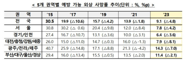 예방 가능한 외상 사망률이 처음으로 한 자릿수에 진입했다. 이 지표는 외상 사망자 중 적절한 치료가 제공됐다면 생존 가능성이 있었을 것으로 판단되는 사망자의 비율이다.
