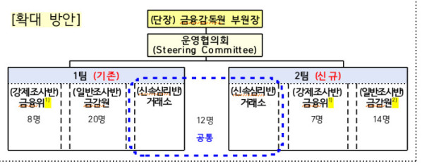 현재 합동대응단은 금융위 강제조사반, 금감원 일반조사반, 거래소 신속심리반으로 구성된 3반 1팀 체제로 운영되고 있다. 개편 이후에는 강제조사반과 일반조사반을 각각 1개씩 추가 신설해 강제조사반·일반조사반·신속심리반(공통 지원)으로 구성된 2개 팀이 동시에 가동된다.