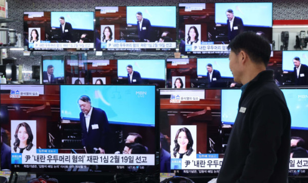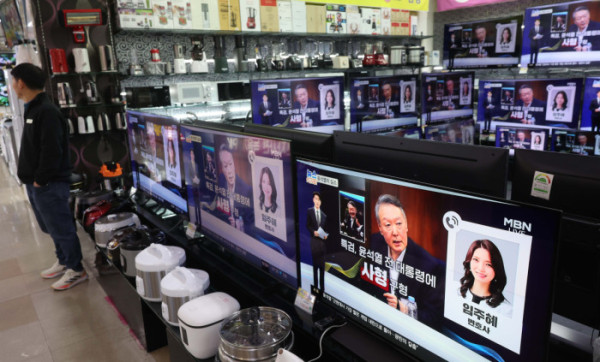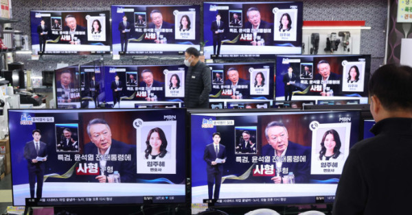 ▲내란특검팀(특별검사 조은석)이 내란 우두머리 혐의를 받는 윤석열 전 대통령에게 법정 최고형인 사형을 구형한 이튿날인 14일 서울 용산구 전자랜드의 한 가전매장 텔레비전에 관련 뉴스가 보도되고 있다. 신태현 기자 holjjak@
