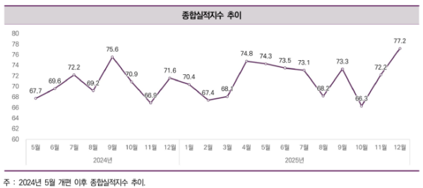 한국건설산업연구원은 14일 발간한 ‘월간 건설시장동향’에서 지난해 12월 건설경기실사지수(CBSI) 종합실적지수가 77.2로 전월 대비 5.0포인트(p) 상승했다고 밝혔다.