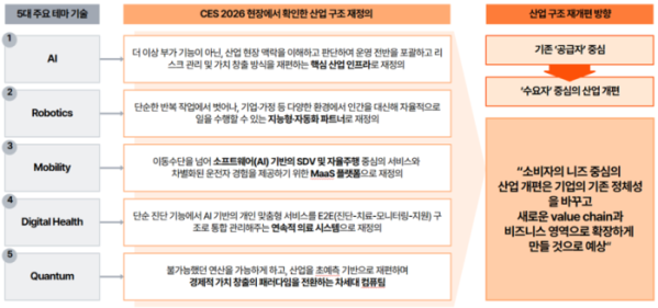 또한 보고서는 올해 CES에 대해 “가전 중심 전시회에서 벗어나 사람과 기술이 결합된 경험의 무대로 완전히 성격이 바뀌었다”고 평가했다. 전시의 중심이 기존 가전업체에서 모빌리티·로보틱스·에너지·AI 반도체 기업으로 이동하는 등 기술 발전이 산업 경계를 재정의하는 흐름이 뚜렷해졌다는 분석이다.