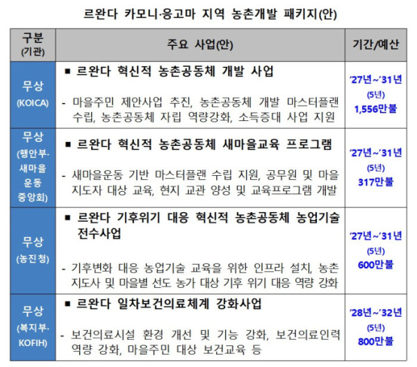 이번에 확정된 르완다 농촌개발 ODA 패키지는 2027년부터 본격 추진될 예정으로 르완다 카모니·응고마 지역을 대상으로 농촌경제 기반 강화와 주민 건강 증진을 동시에 추진하는 것이 목표다. 국조실을 중심으로 한국국제협력단(KOICA), 행정안전부, 보건복지부, 농촌진흥청 등의 사업을 연계해 마을환경 개선 역량 강화 농업기술 확산과 함께 일차보건의료체계 강화를 병행한다.