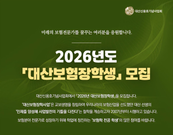 대산신용호기념사업회는 국내 보험학 분야의 우수 인재를 발굴하고 육성하기 위해 2월 6일까지 ‘2026년 대산보험장학생’을 모집한다고 15일 밝혔다.