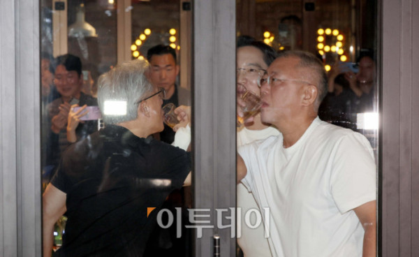 ▲젠슨 황(왼쪽부터) 엔비디아 최고경영자(CEO), 이재용 삼성전자 회장, 정의선 현대차그룹 회장이 지난해 10월 30일 서울 강남구 삼성동의 한 치킨집에서 회동을 갖고 러브샷을 하고 있다. 신태현 기자 holjjak@ (<우린 깐부잖아>)