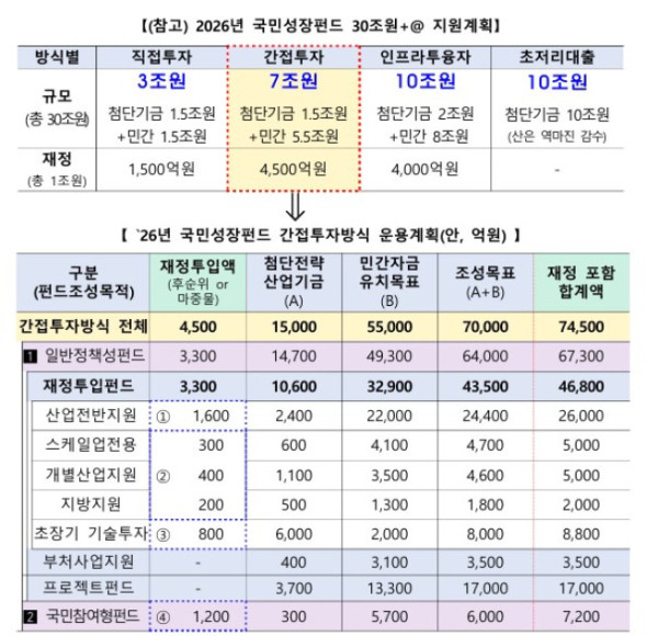 재정자금이 우선적으로 투입되는 펀드(재정모펀드)는 산업전반지원(1600억 원), 스케일업·개별산업·지방지원(900억 원), 초장기기술투자(800억 원), 국민참여형(1200억 원)으로 구분해 총 4개사를 선정한다.