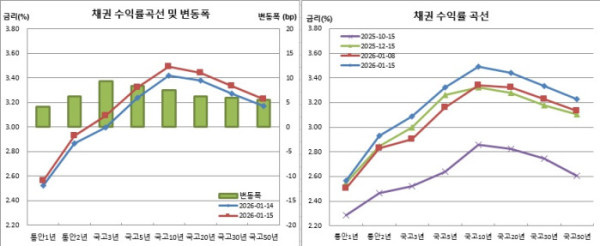15일 채권시장과 금융투자협회에 따르면 통안1년물은 4.1bp 상승한 2.565%를, 통안2년물은 6.3bp 오른 2.928%를, 국고3년물은 9.4bp 올라 3.090%를 기록했다. 이는 각각 지난해 12월12일(각각 2.598%, 2.933%, 3.093%) 이후 최고치다. 국고10년물은 7.5bp 올라 3.493%를, 국고20년물은 6.3bp 오른 3.4415를, 국고30년물은 5.9bp 상승해 3.334%를 보였다. 이 또한 2024년 6월3일(각각 3.532%, 3.451%, 3.368%) 이래 가장 높은 수준이다. 국고50년물 역시 5.5bp 오른 3.228%에 거래를 마쳤다. 이 또한 2024년 6월12일(3.233%) 이후 최고치다.