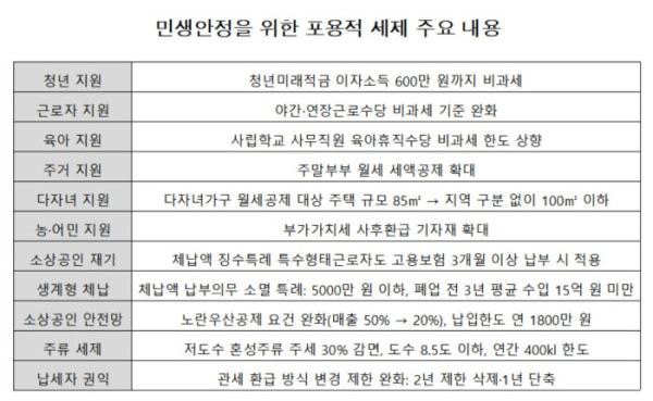 ▲2025년 세제 개편 후속 시행령 개정 중 민생 안정을 위한 포용적 세제 주요 내용 (재정경제부)
