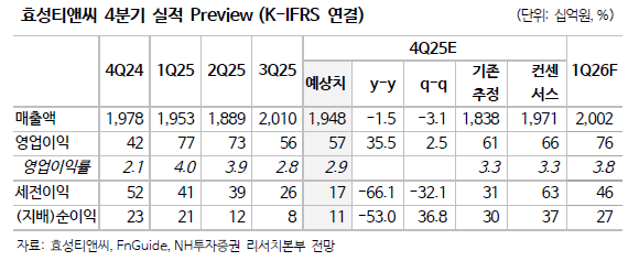 최영광 NH투자증권 연구원은 "효성티앤씨의 4Q 영업이익이 575억 원(+2.5% q-q, 영업이익률 2.9%)으로 컨센서스를 하회할 전망"이라며 "중국과 유럽의 수요 개선 영향으로 스판덱스 판매량과 이익은 전분기 대비 증가했으나, 중국 내 노후 설비 구조조정 과정에서 일회성 비용이 발생한 영향"이라고 평가했다.