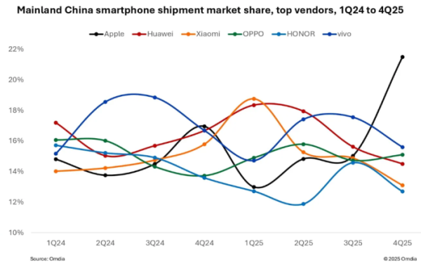 4분기에는 연말 판촉과 중국 정부의 보조금 정책 영향으로 감소 폭이 둔화했다. 중국 본토 스마트폰 시장은 4분기에 지난해 같은 기간보다 1% 감소한 7640만 대를 출하했다. 애플이 1650만 대(점유율 22%)로 1위를 기록했고, 비보는 1190만 대(16%)로 2위, 오포는 1160만 대로 3위에 복귀했다. 화웨이는 1110만 대로 4위, 샤오미는 1000만 대로 뒤를 이었다.