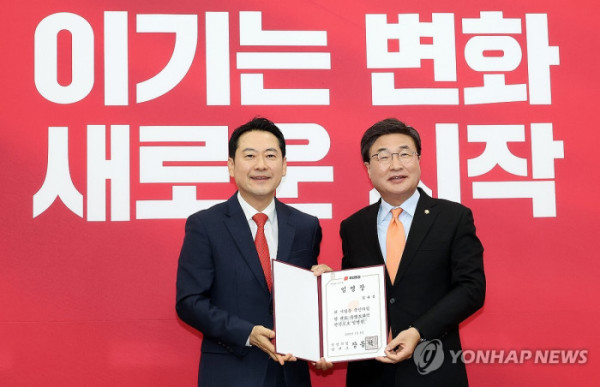 ▲국민의힘 장동혁 대표가 15일 국회에서 열린 최고위원회의에서 김대식 당 대표 특별보좌역 단장에게 임명장을 전달한 뒤 기념촬영을 하고 있다. (연합뉴스 )