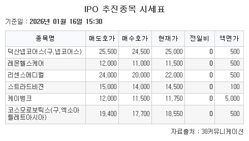 IPO(기업공개)관련 상장 예비심사 청구종목으로 특수 목적용 항법 및 항재밍 토탈 솔루션 전문업체 덕산넵코어스(구 넵코어스)와 인터넷 전문은행 케이뱅크는 호가 변화가 없었다.