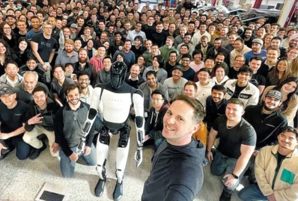 ▲자신이 개발을 주도한 휴머노이드 로봇 옵티머스를 앞에 두고 동료 직원들과 기념 촬영을 하고 있는 밀란 코박 전 부사장(맨 앞 서 있는 이). 현대차그룹은 16일 그를 자문역으로 영입했다고 밝혔다.