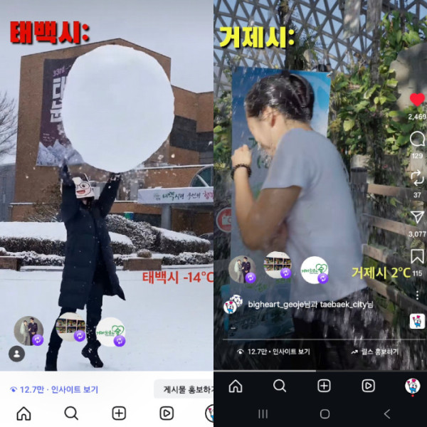 거제시가 강원 태백시와 손잡고 제작한 이색 협업 홍보 영상이 SNS에서 예상 밖의 반향을 일으키고 있다. '눈 오는 도시'와 '눈이 거의 오지 않는 도시'라는 극명한 기후 차이를 전면에 내세운 콘텐츠가 게시 하루 만에 조회수 10만 회를 돌파하며 행정 홍보의 새로운 가능성을 보여줬다는 평가다.