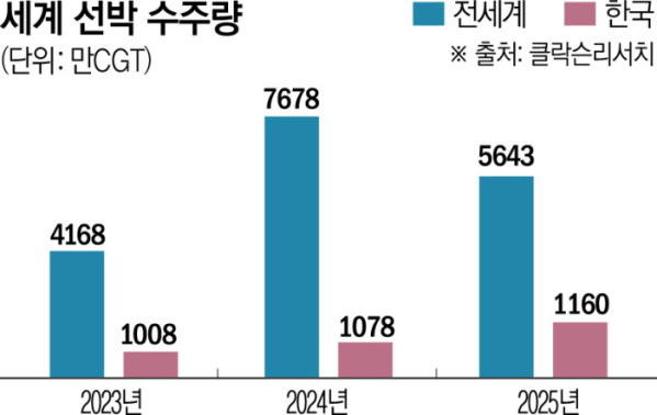 반면 국내는 같은 기간 1160만CGT(247척)를 기록해 전년(1078만CGT(254척)보다 8%가량 증가했다. 수주 척수는 소폭 줄었지만, 액화천연가스(LNG) 운반선 등 대형·고부가 선종 비중이 확대되면서 CGT 기준으로 증가세를 기록한 것이다.