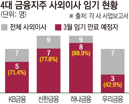 18일 금융권에 따르면 4대 금융지주(KB·신한·하나·우리) 사외이사 32명 중 23명(71.9%)의 임기가 올해 3월 말 만료된다. 지주별로는 하나금융이 9명 가운데 8명으로 가장 많고, 신한금융(7명), KB금융(5명), 우리금융(3명) 순이다. 금융지주 사외이사는 최초 선임 시 2년, 이후 연임 시 1년씩 임기가 연장되는 구조다. 그동안 교체 폭은 통상 1~2명에 그쳤다. 그러나 올해는 당국의 지배구조 특별점검과 인적 쇄신 압박이 맞물리며 분위기가 급변했다.
