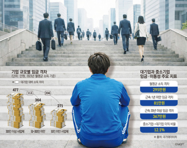 근속 기간이 길어질수록 격차는 더 확대됐다. 근속 1년 미만 신입사원 시기에는 대기업과 중소기업 간 월평균 소득 차이가 81만 원에 그쳤지만, 근속 20년 이상에서는 367만 원으로 벌어졌다. 중소기업에 취직하면 대기업으로 이동하기 어려운 구조도 고착화돼 있다. 2023년 기준 중소기업에서 대기업으로 이직한 비율은 12.1%에 불과했고 중소기업에서 다른 중소기업으로 이동한 경우가 81.3%로 대부분을 차지했다.