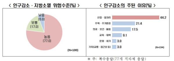 비수도권 시·군 지방자치단체 10곳 중 7곳 이상(77.0%)은 인구감소 및 지방소멸 위험을 심각하게 인식하고 있는 것으로 나타났다. 가장 큰 원인으로는 일자리 부족이 꼽혔다.