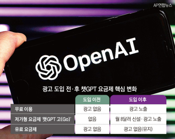 19일 업계에 따르면 오픈AI는 저가형 구독 서비스인 '챗GPT 고(Go)'를 한국을 포함한 전세계에 출시하며 무료∙저가형 요금제에 광고를 시범 도입한다. 광고가 포함된 챗GPT 고의 구독료는 월 8달러(약 1만1000원)다. 샘 올트먼 오픈AI 최고경영자(CEO)가 2024년 5월 하버드대 강연에서 “광고 비즈니스 모델은 최후 수단”이라고 언급한지 1년 7개월 만이다.