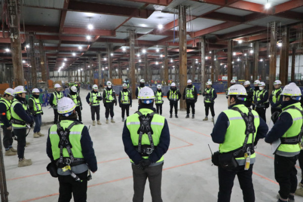 이 과정에서 한 근로자가 ‘안전’을 외치자 ‘최우선의 가치, 좋아 좋아 좋아’라는 구호가 잇따랐다. 현장 근로자들은 회의 내내 이 구호를 반복해 외치며 안전의 중요성을 스스로 상기했다. 이후 작업 투입 직전에는 각 팀장이 다시 한 번 작업별 위험 요소를 알렸다.