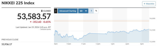 그린란드 병합과 관련해 도널드 트럼프 미국 대통령이 "반대국에 관세를 부과하겠다"고 밝힌 이후 아시아 투자심리가 위축됐다. 일본과 홍콩 증시는 부진한 모습을 보였고, 대만은 상대적으로 선방했다는 평가를 받았다.
