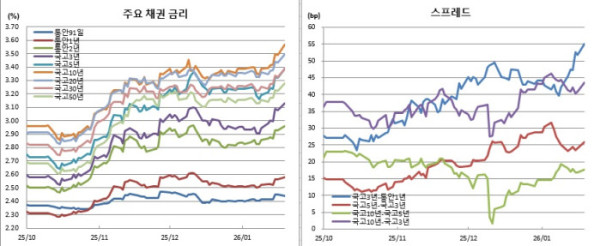 지난주 매파적(통화긴축적)이었던 한은 1월 금융통화위원회 여진이 계속되는 분위기다. 아울러 지난주말 미국채 10년물 금리가 4.2%를 돌파한데다, 일본 재정우려로 일본 30년물금리가 10bp 넘게 급등한 것이 영향을 미쳤다. 수급적으로는 외국인이 3년 국채선물을 매도한 것도 약세장을 부추겼다.