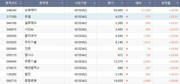 코스닥에서는 뉴로메카, 러셀, 셀루메드, 시선AI, 옵티코어, 우리기술, 인콘, 캠시스, 푸른기술, 해성옵틱스, 협진, 휴림로봇 등이 상한가를 기록했다.