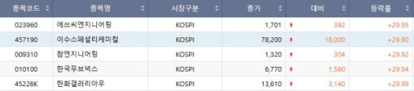 19일 코스피 시장에서 상한가를 기록한 종목은 에쓰씨엔지니어링, 이수스페셜티케미컬, 참엔지니어링, 한국무브넥스, 한화갤러리아우 등이다.