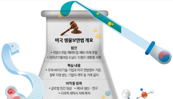 21일 업계에 따르면 지난해 말 미국 의회에서 생물보안법을 담은 국방수권법(NDAA)이 의결됐고, 도널드 트럼프 대통령이 서명했다. 법안에는 ‘우려 대상 바이오 기업’으로 지정되면 연방정부 및 산하 기관이 해당 기업의 장비·서비스 조달을 금지하도록 하는 내용이 담겼다. 미국 정부 자금이 투입되는 연구·조달·임상·공공 프로젝트 전반에서 해당 기업과의 거래를 사실상 차단하겠다는 취지다.