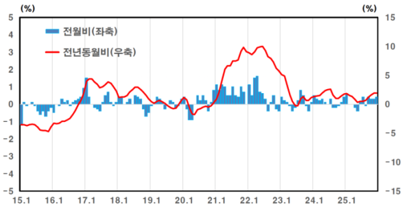 한편 2025년 생산자물가지수는 전년 대비 1.2% 상승했다. 코로나19 팬데믹이 한창이던 2022년 8.4%가 올랐던 연간 생산자물가는 2023년 이후 1%대 상승 흐름(23년 1.6% 24년 1.7%)을 이어가고 있다. 연간 국내공급물가지수와 총산출물가지수는 전년 대비 각각 0.7%, 1.5% 올랐다.