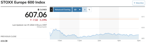 유럽증시는 19일(현지시간) 도널드 트럼프 미국 대통령이 그린란드 합병 구상에 반대하는 유럽 8개국에 관세 부과를 위협한 데 대한 반응으로 하락했다.