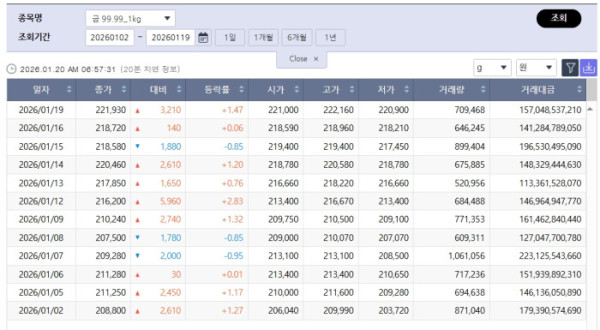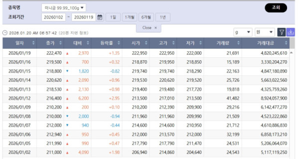국제 가격 급등은 국내 시세에도 그대로 반영됐다. 한국거래소 금시장(KRX)에 따르면 19일 금 99.99% 1kg 종가는 22만1930원으로 집계됐다. 이는 연초(2일) 종가 20만8800원 대비 약 6.3% 상승한 수준이다. 특히 12일(21만6200원) 이후 불과 일주일 만에 5700원 이상 오르며 상승 속도가 뚜렷하게 빨라졌다. 하루 상승 폭도 1000~3000원대로 확대되며 최근 며칠 사이 가격이 계단식으로 뛰는 흐름이 이어지고 있다. 소액 투자 기준으로 많이 거래되는 미니금 100g 가격 역시 1월 19일 22만2470원으로 마감했다.