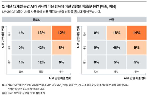 조사 결과, AI 투자 대비 실질적 성과를 거두는 기업은 소수에 그쳤다. 지난 1년간 AI 도입을 통해 추가 매출을 창출했다고 응답한 CEO는 30%였으며, 비용 절감 효과를 본 기업은 26%로 집계됐다. 하지만 응답자의 22%는 오히려 비용이 늘었으며 절반이 넘는 56%의 CEO는 매출 증가나 비용 절감 효과를 전혀 체감하지 못했다고 답했다. 이 가운데 매출 증가와 비용 절감이라는 성과를 모두 거둔 기업은 전체의 12%에 불과했다. 한국은 이보다 소폭 높은 14%를 기록했다.