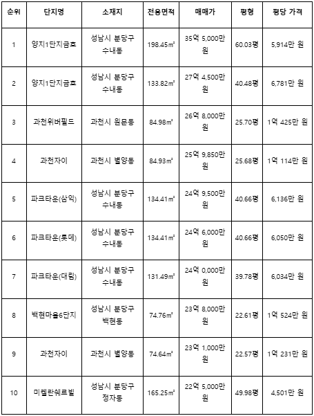 20일 부동산 정보 애플리케이션 집품이 지난해 12월부터 이달 19일까지 경기도 아파트 매매 거래를 분석한 결과 최고가 상위 10건이 모두 성남시 분당구와 과천시에서 발생한 것으로 집계됐다. 분당구에서는 수내동과 정자동이, 과천시에서는 별양동과 원문동 소재 단지가 상위권에 포함됐다.